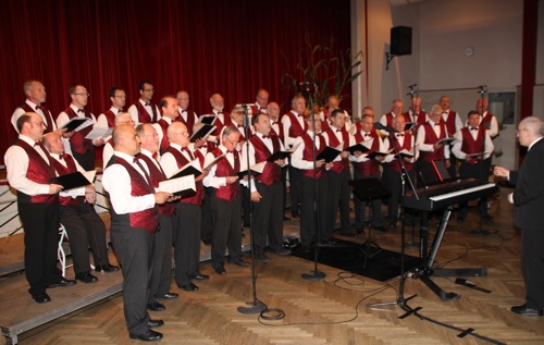 Sie begannen mit „You raise me up“ und „Das Beste“ bevor sie spätestens bei „Dancing Queen“ Bewegung auf die Bühne brachten, die sie im „Hallelujah“, bei „Für alle“ und „An Tagen wie diesen“ beibehielten. Auch hier war die Zugabe „Ein Kompliment“ praktisch vorprogrammiert und unausweichlich. Den Vogel des Abends schossen aber wie so oft die Sänger vom „Kleene Bus“ Mudau unter musikalischer Leitung von Gerhard Bönig ab. „Fpaniff“ – nein es ist kein Schreibfehler, sondern ein ebenso schwierig auszusprechender wie lustiger Liedtext über einen jungen Mann mit Sprachfehler, der diesen mit Hilfe eines cleveren Managers zum Hit macht. „Kann man Frauen trauen“, präsentierte dann Solist Uwe Lenz als gesangliche und schauspielerische Glanzleistung mit Unterstützung seiner Sängerkollegen bevor man schwungvoll mit „Viva la Companeia“ die Einlage des „Kleene Bus“ schloss. Mit einem Dank an alle, die zum Gelingen des Abends beigetragen hatten lud Wolfgang Radauscher das begeisterte Publikum ein, bei einem weiteren guten Glas Wein und möglicherweise gemeinsamem Gesang den Abend ausklingen zu lassen.