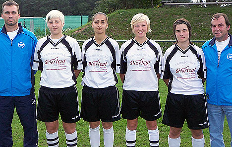 Das Bild zeigt von links nach rechts, Trainer Horst Haselmann in seiner zweiten kompletten Saison, Jennifer Lohmann vom Landesligameister SSV Waghäusel, Zozan Özdemir vom TSV Buchen, Tabea Schneider vom FC Hettingen, Kathleen Trunk, nach ihrer Rückkehr aus der B-Jugend der TSG 1899 Hoffenheim und Klinge Urgestein und 1. Vorsitzender Hubert Lang. (Foto: privat)
