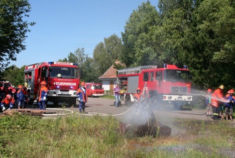 Seckach. Es brennt beim Fischteich Großeicholzheim! – Doch kaum haben die Flammen Nahrung befunden, hörte man auch schon das Martinshorn der Feuerwehr und rd. 20 Ferienkinder spurteten im Rahmen des Schlotfeger-Ferienprogramms zusammen mit der Jugendwehr aus den Löschfahrzeugen der Seckacher Gesamtwehr, um unter der kind- und fachgerechten Anleitung von Stefan Krahn, Steffen Wallisch, Tobias Weber sowie Hildegund und Friedrich Korth dem Leitspruch der Floriansjünger zu folgen: „Gott zur Ehr, dem Nächsten zur Wehr“.