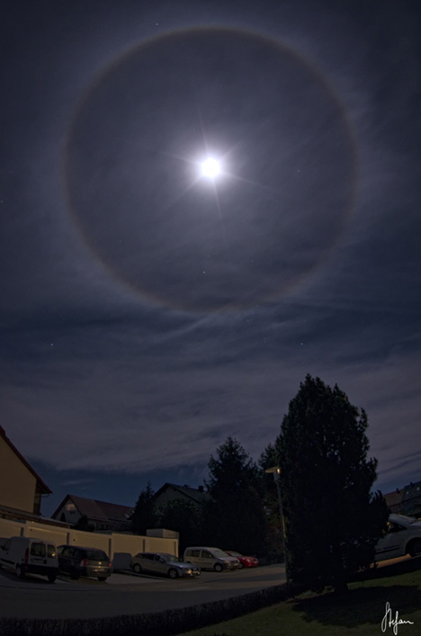 Waldbrunn. Einen Mondhalo gab es in der Nacht über Waldbrunn zu sehen. Damit dieses Naturereignis auftritt müssen Eiskristalle in Höhe von 8 bis 10 Kilometer vorhanden sein. Das Licht, in diesem Falle das des Mondes, wird von den durchsichtigen Kristallen gebrochen und bildet einen sogenannten 22°-Ring.