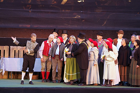 Helmut und Birgitta Peschel (rechts am Rand, mit grünen Hosenträgern bzw. schwarzer offener Weste) aus Eberbach sind von Anfang an und damit schon 29 Jahre aktiv im Chor der Schlossfestspiele Zwingenberg. Was sie besonders reizt, ist die Möglichkeit, neben dem Gesang auch schauspielerisch tätig sein zu können – wie 2011 in „Die Lustigen Weiber von Windsor“. (Foto: LRA)