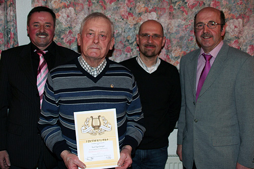 Dem 1. Vorsitzenden Thomas Haber oblag es anschließend, Karl Egenberger für seine 40-jährige Sängertätigkeit mit der Goldenen Vereinsnadel mit Ehrenurkunde auszuzeichnen und ihn aufgrund seiner Treue, Zuverlässigkeit und der Ausübung eines Vorstandsamtes zum Ehrenmitglied zu ernennen. Mit der Silbernen Vereinsnadel und Ehrenurkunde ausgezeichnet wurde zudem Hans Müsebeck, der seit 40 Jahren als passives Mitglied dem Verein die Treue hält.