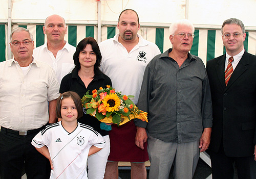 Für den SV Großeicholzheim überbrachte 1. Vorsitzender Thomas Kegelmann Glückwünsche und den obligatorischen Fußball zum Jubiläum. Dem 1. Vorsitzenden Martin Müller oblag es anschließend mit Unterstützung seiner Stellvertreterin Brunhilde Pistor, überaus erfolgreiche Mannschaften in den Sparten Kegeln und Tischtennis, stellvertretend Franz Dollinger und Ekkehard Brand, sowie langjährige Mitglieder für ihre Treue zum SVS auszuzeichnen.