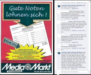 Wie die Screenshots zeigen, wurde auf der schuleigenen Facebook-Seite die Werbeaktion einer Elektronikkette weiterverbreitet. Ein ehemaliger Schüler störte sich daran, dass eine staatliche Schule die Aktion unterstützt und kostenlos für Verbreitung der Werbung sorgt.