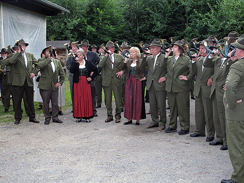 Jagdhornbläserinnen und –bläser der Jagdhornbläsergruppen Mosbach und Buchen umrahmten gemeinsam die feierliche Unterzeichnung der Vereinbarung „Pakt für die Jagd“ an der Schefflenzer Waldspitzhütte. (Foto: LRA)