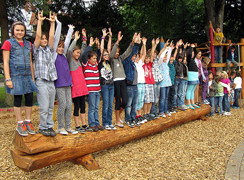 Zum Abschluss „Ihrer“ Feierstunde überreichten die Viertklässler der Schulgemeinschaft als ganz besonderes Geschenk einen Balancierbalken in Form eines Drachens, welcher den neugestalteten Pausenhof wunderbar ergänzt und natürlich sofort von allen Schülerinnen und Schülern ausprobiert wurde, bevor die Stars des Tages den bunten Vormittag zusammen mit ihren Eltern und Lehrern ausklingen ließen.