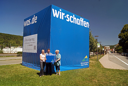 Mosbach. (pm) Er ist 5x5x5-Meter groß und soll in den kommenden beiden Wochen mehr Menschen im Neckar-Odenwald-Kreis auf den Freiwilligentag der Metropolregion Rhein-Neckar aufmerksam machen. Die Rede ist vom blauen „wir-schaffen-was“-Würfel. Seit gestern steht er in Mosbach an der Neckarelzer Straße und wirbt für die regionale Ehrenamtsaktion am 15. September.