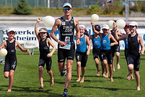Viernheim-Sieger wird vom Nachwuchs gefeiert. (Foto: 21sportsgroup)