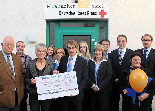 Philipp Kästner (Auszubildender der Volksbank eG Mosbach 1. Reihe 3. von links) bei der Spendenübergabe an Hella Dammert (1. Reihe, 2. von links) vom Mosbacher Tafelladen.