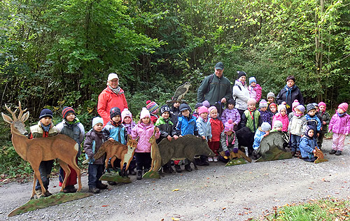 Wobei als erster Höhepunkt der Besuch von Revierförster Armin Walzel galt. Er wusste einfach unglaublich viel zu erzählen über Bäume und Tiere unseres Waldes. Als zweite Überraschung tauchten die Klassen eins und zwei der ortsansässigen Grundschule im „Waldkindergarten“ auf und schließlich wurde es mit Waldfacharbeiter Klaus, der demonstrierte, warum überhaupt und wie man korrekt Bäume fällt.