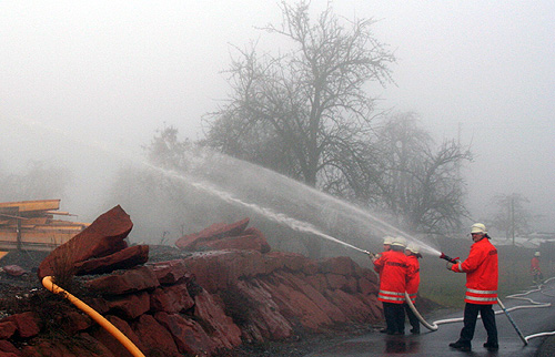 Doch zunächst zum Ablauf: Starke Rauchentwicklung im neuen Stallgebäude war durch vorbeifahrende Fahrzeuge auf der naheliegenden Landstraße aufgrund der nebeligen Wetterlage leider erst spät entdeckt und gemeldet worden. Die Alarmierung über Sirene und Piepser durch die Leitstelle Mosbach erfolgte um 15 Uhr, und nur Minuten später waren beide Abteilungswehren nahezu vollständig zur Stelle. Die Freiwillige Feuerwehrabteilung Scheidental begannen mit dem sofortiger Aufbau der Wasserversorgung durch Wasserentnahme aus dem naheliegenden Hydranten und begann mit 2 C-Rohren die Löscharbeiten (2 C-Rohre) am Brandobjekt und mit der Erkundung der Einsatzstelle durch die Atemschutzgeräteträger.