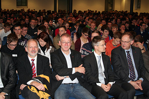„2011 konnten laut dem Verein Deutscher Ingenieure (VDI) 72 000 offene Ingenieursstellen nicht besetzt werden“, ergänzte Prof. Dr. Max Mühlhäuser, Prorektor und Dekan der Fakultät Technik. Er betonte, dass die Duale Hochschule viel Eigeninititative, Interesse an der akademischen Lehre und „Transferkompetenz“ verlange und deshalb – entgegen dem Glauben vieler – anders als Schule sei. Sein Tipp an die Erstsemester: „Schlagen Sie sich nicht als Einzelkämpfer durch, sondern organisieren Sie sich in Teams und lernen Sie gemeinsam.“