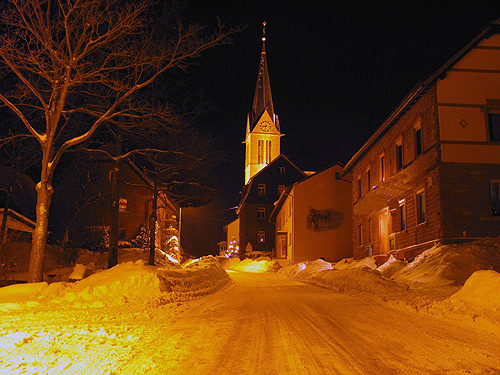 Stimmungsvolles Schloßau im Jahr 2010. Christbäume und weihnachtlicher Lichterglanz kündigen während der Adventszeit das bevorstehende Weihnachtsfest an. Bei Schnee und Eiseskälte zieht man sich auch in Schloßau gerne in die warme Stube zurück und bereitet alles zum Fest vor.(Foto: Thomas Müller)