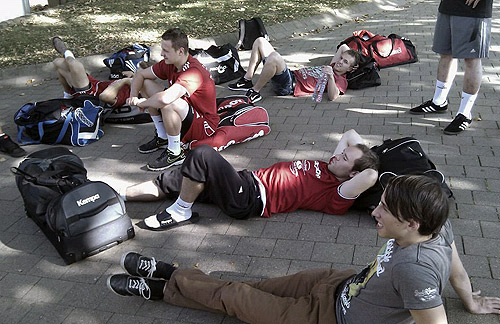 Entspannt vor dem nächsten Spiel: Gehring, Mittmann, Gärtner und Weimann. Doch der Anschein trügt, die Handballer des TVM sind heiß auf die nächste Auswärtsbegegnung. (Foto: Heiß)