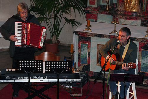 Mit seinem Lied „Ich wär so gern dein Troubadour“ brachte Stefan Jakob sicher einige zum Nachdenken, aber andere auch zum Schmunzeln – wie zum Beispiel Pfarrer Martin Drathschmidt, der an den „Troubadix“ aus den Asterix-Heften dachte, der ganz anders als Troubadour Jakob wegen seines schrecklichen Gesangs weit ab von den Menschen gefesselt worden war. Der Dank des Pfarrers ging voll Bewunderung an die beiden Musiker, „die nur mit den 6 Seiten der Gitarre, den wenigen Tasten des E-Pianos und einer Stimme die Besucher mit ihren Liedern berührt haben“, und ihnen Hoffnung und Lebensfreude in den Alltag mitgaben.