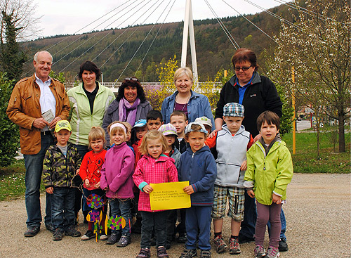 Die Kinder haben mit ihren selbstgebastelten Fischen und mit der Klangeschichte“ Ein kleiner Fisch “ die Belegschaft des Angelgeschäftes Zöller mit Frau Zöller (rechts) und Sabine Bahler (2. von links) erfreut. Bürgermeister Peter Kirchesch (links) dankte ebenfalls für die Spenden, die er immer mit in Empfang nehmen durfte. Er freue sich mit dem „Kindergarten St. Franziskus“ über die wertvolle Unterstützung und die immer herzliche Aufnahme. Nach fröhlichen Liedern machte sich die heitere Kinderschar auf den Heimweg vom Angelsportgeschäft an der B 37 B zum Kindergarten am „Mittelberg“.
