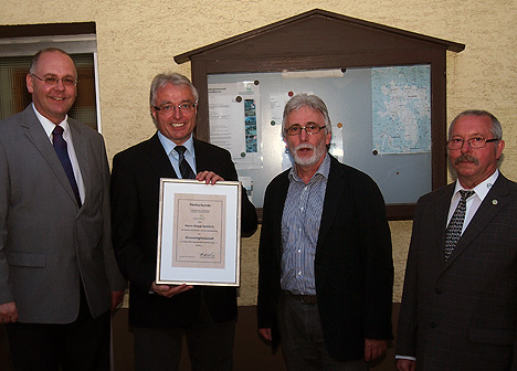 Unser Bild zeigt das neue Ehrenmitglied des Verbands Wohneigentum, Bürgermeister a.D. Klaus Schölch (2.v.li.) mit dem Landesvorsitzenden Harald Klatschinski (li.), Landesgeschäftsführer Axel Ackermann (2.v.re.) und Gemeinschaftsleiter Günter Gepperth (re.) vor dem Siedlerheim im Strümpfelbrunn. (Foto: Hofherr)