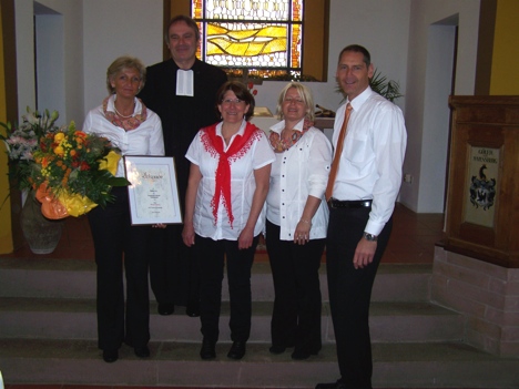 Christiane Springer (li.) hält dem Evangelischen Kirchenchor Waldkatzenbach bereits seit 30 Jahren die Treue. Dafür wurde sie von Pfarrer Gerd Stauch, Dirigentin Karin Rexroth und den Vorständen Reiner Springer (re.) und Karin Lopinsky (2.v.re) geehrt. (Foto: privat)