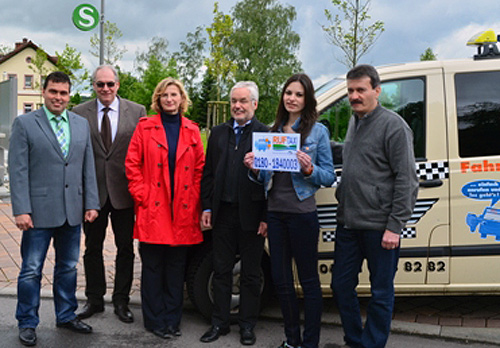 Das Bild zeigt von links: Dirk Schäfer vom Landratsamt, Bürgermeister Wolfgang Schirk (Neunkirchen), Bürgermeisterin Sabine Schweiger (Aglasterhausen), Bürgermeister Theo Haaf (Schwarzach) und die Taxiunternehmerfamilie Ilgin. (Foto: privat)