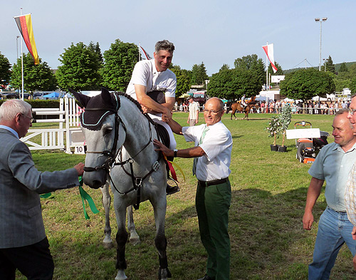 Zum zweiten Mal gewann Jürgen Kurz die Springprüfung Klasse S mit Siegerrunde und damit den Ehrenpreis der vier Bürgermeister der Oberzentgemeinden Beerfelden, Rothenberg, Sensbachtal und Hesseneck, einen Motorroller, den er zur Freude des Publikum gleich nach der Siegerrunde im Parcours testete.