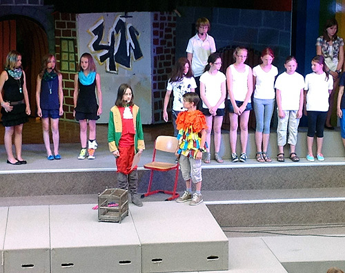Der Ravensburger Kantor Michael Bender, der die Zauberflöte für Kinder einrichtete, kürzte das Werk allerdings von drei auf eine Stunde und statt eines Orchesters übernahm die Begleitung das vierhändig gespielte Klavier. Dass der Unterstufenchor in diesem Jahr die „Zauberflöte“ aufführte, so betonte Wiedenmann in seiner Begrüßung, war kein Zufall: Dieses Jahr vor genau 250 Jahren, 1763, begab sich Leopold Mozart mit seinen beiden Kindern Nannerl und Wolfgang mit der Kutsche auf eine dreieinhalb-jährige Reise durch Europa. Diese wird auch als „Wunderkindreise“ bezeichnet.