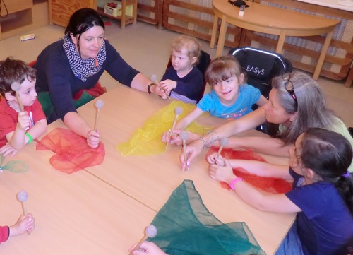 Beim Lernen eines neuen rhythmischen Sprachverses, der durch begleitende Gestik und Mimik leicht eingängig ist, beobachten auch die Kleinsten bereits genau, so Sybille Schönleber weiter. „Es ist schön zu sehen, mit wie viel Begeisterung die Kinder dieses Angebot wahrnehmen.“ Wöchentlich werden den Kindern gemeinsam mit der musikpädagogischen Fachkraft Susanne Schulz Einheiten von 60 Minuten geboten. Susanne Schulz setzt hierbei gezielte musikpädagogische Impulse, die von Kindergartenleiterin Heike Beilhardt und Sybille Schönleber im Kindergartenalltag vertieft werden.