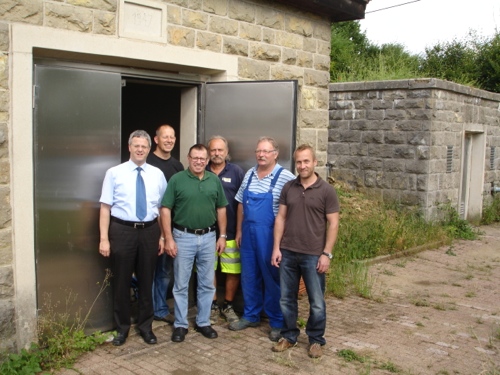 Hierzu trafen sich Vertreter der Gemeinde, des Ing.Büros Fritz-Planung aus Bad Urach, der Firma Schuler aus Mosbach und der Wasserversorgung Bauland GmbH (WVB) auf dem Waidachshof, um die von der Firma Schuler ausgeführte technische Sanierung des Hochbehälters und der Druckerhöhungsanlage zu begutachten. Die Firma Schuler hat mit dem Auskleiden der Wasserkammer mit Edelstahl, der Änderung der Belüftungsanlage, Erneuerung von Zu- und Ablaufleitungen im Hochbehälter sowie der Sanierung der Druckerhöhungsanlage das Ganze auf den neuesten Stand der Technik gebracht und so sicher gestellt, dass der aus dem Jahre 1947 stammende Hochbehälter auch nach der Umsetzung der Wasserversorgungskonzeption für die Gesamtgemeinde bestehen bleiben.