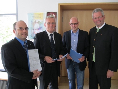 Übergabe der Unterschriftenliste an Landesbischof Ulrich Fischer. v.l. Pfarrer Wolfgang Müller, Bischof Ulrich Fischer, Sebastian Damm und Bundestagsabgeordneter Alois Gerig. (Foto: privat)