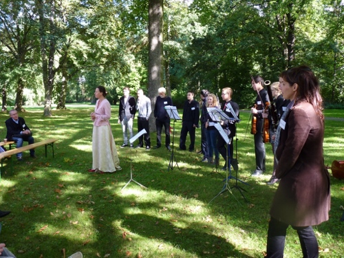 Die jungen Choristen sangen gemeinsam mit der Mezzosopranistin und künstlerischen Leiterin Paula Fünfeck unter dem Dirigat der musikalischen Leiterin des Projektes Anna-Sophie Brüning, Werke von Claudio Monteverdi, Orazio Vecchi und Johann Sebastian Bach, was für staunende Gesichter und ungläubiges Nachfragen im Schlossgarten sorgte. Ein Teilnehmer sprach ein dadaistisches Gedicht in ein Megaphon hinein und erregte verblüffte Heiterkeit. Begleitet wurde der kleine Chor von sechs Musikern des Landesjugendorchesters Baden-Württemberg, die sich weder vom Wind, der ihnen die Notenblätter entführen wollte, noch von einem der Kälte wegen verstimmten Cello entmutigen ließen.