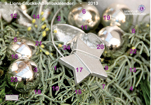 Der Lions-Glücks-Adventskalender verknüpft auf besondere Weise drei Dinge. Eine gute Tat für die Jugend der Region, eine spannende Adventsaktion und die Chance auf einen tollen Gewinn. Jeder Kalender hat auf der Vorderseite eine Nummer, die als Lotterielos zu verstehen ist. Je mehr Kalender man hat, umso größer die Chancen, bei der täglichen Gewinnziehung einen der 618 Preise zu gewinnen. Der kleinste Preis ist 25 Euro wert, der größte Einzelgewinn ist der 3.000-Euro-Reiesgutschein. Hinter jedem Türchen stehen mehr als 1.000 Euro. Die Adventszeit verspricht wieder eine spannende Zeitungszeit zu werden. Die Gewinn-Nummern werden ab dem 1. Dezember wieder täglich in der Rhein-Neckar-Zeitung und den Fränkischen Nachrichten zu lesen sein. Parallel zur Druckausgabe befindet sich auch im Internet auf der Homepage des Lionsclubs ein digitaler Adventskalender, der nun schon zum neunten Mal durch Michael Schler, Blatten Online Service und Felizitas Zemelka aus Buchen programmiert und zur Verfügung gestellt wird. So kann jeder ab Null Uhr die Gewinner des Tages auf der Homepage www.lionsclub-madonnenland.de einsehen.