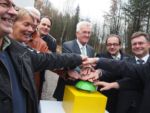 Buchen. Ministerpräsident Winfried Kretschmann hat mit Unterstützung der Betreuungsabgeordneten MdL Charlotte Schneidewind-Hartnagel (Bündnis 90/Grüne), MdL Georg Nelius (SPD), Landrat Dr. Achim Brötel und Bürgermeister Roland Burger im „Großen Wald“ auf Gemarkung Hettingen und Rinschheim den bisher größten Windpark des Landes Baden-Württemberg in Betrieb genommen.