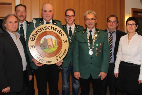 Beim Preisschießen siegte mit einem 16-Teiler Wolfgang Dambach, dicht gefolgt von Simone Bärhausen mit einem 28,3-Teiler, Christian Meixner mit einem 62,6-Teiler, Willi Strohmer mit einem 73,8 Teiler, Gerhard Mechler mit einem 98,2-Teiler, Philipp Schule mit einem 143,7-Teiler, Karlfried Dieterle mit einem 161,2-Teiler, Stefan Straub mit einem 176,8-Teiler, Jan Heners mit einem 228,1-Teiler und Jürgen Hofmann mit einem 364,5-Teiler. Mit Spannung erwartet hatten alle Anwesenden die Proklamation des Schützenkönigs 2014. Und mit viel Beifall wurde Gerhard Mechler Dank seines 128,5-Teilers in dieses Amt eingeführt. Ihm zur Seite stehen als 1. Ritter Steffen Hemberger (239,6-Teiler) und als 2. Ritter Wolfgang Dambach (301,6-Teiler). Als Jungschützenkönig hatte sich Lennert Meyer mit 9 Ringen verdient gemacht.