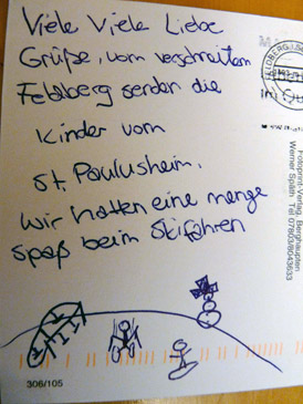 „Wir hatten eine Menge Spaß beim Skifahren“ schrieben die Heimkinder in der letzten vom verschneiten Feldberg im Schwarzwald, wo sie nun eine Skifreizeit verbrachten, für die der Konzerterlös mit verwendet wurde.