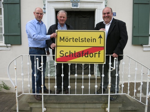 Mörtelstein. (pm) Mit einer außergewöhnlichen Aktion machen die vier Mörtelsteiner Gemeinderatskandidaten von CDU und Freien Wählern auf die drohende Entwicklung von Mörtelstein hin zu einem sogenannten „Schlafdorf“ aufmerksam. Das Besondere an dieser Aktion, die pünktlich zur heißen Phase im Kommunalwahlkampf gestartet wurde, ist der parteiübergreifende Konsens, dass ohne ein professionelles Dorfentwicklungskonzept das soziale und öffentliche Leben im kleinsten Ortsteil der Gemeinde Obrigheim kurz vor dem Aus steht. „Es ist fünf vor zwölf“, so die beiden amtierenden Mörtelsteiner Gemeinderäte Horst Keller (CDU) und Uli Halder (Freie Wähler). „Wir wollen kein Schlafdorf werden! Wir wollen unser Dorfleben erhalten“.