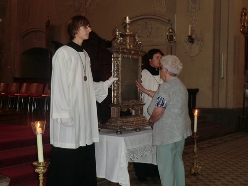 Der Blutschrein wird in der vierwöchigen Hauptwallfahrtszeit zu mehreren Terminen vor dem Hochaltar aufgestellt, damit ihn alle Pilger berühren können. Ansonsten ist er nur über eine schmale Treppe hinter dem Blutaltar zu erreichen. (Foto: pm)