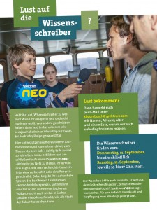 Am ersten Tag gibt es das journalistische Handwerkszeug. Der zweite Tag ist dann der Vor-Ort-Recherche gewidmet, bevor das Ganze am dritten Tag in selbst gefertigte Berichte, Reportagen, Interviews und Bilder umgesetzt wird und auf der Spektrum neo-Website erscheint (www.spektrum-neo.de, dort auch die Artikel vom letzten Jahr). Zum Thema „Unsere Erde“ erwarten die „Wissensschreiber“ Recherchen in Sachen Vulkane am Katzenbuckel, zur Geothermie, zum Urmenschen „Homo heidelbergensis“ und über „Vergangenheit und Zukunft unserer Stadt“