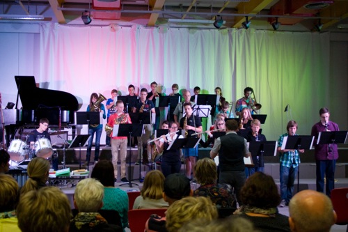 Neben der Bildenden Kunst gesellte sich die klingende Kunst und zwar in Form eines Konzertes in der Aula der Schule. Wieder einmal bestachen verschiedene Ensembles und Orchester durch abwechslungsreiches und qualitativ hochwertiges Musizieren, für jeden Geschmack war etwas dabei. Das Konzert eröffnete das Unterstufenorchester Piccola Banda unter der Leitung von Fabian Stoffler, das sauber intoniert und voll Freude am gemeinsamen Musizieren kurze Tanzstücke zum Besten gab, gefolgt von den kleinen Meistern der Improvisation, der Kiddies‘ Band, die von Gernot Ludwig angeleitet wird und die für die kleinen Freunde der Jazzmusik auch in Zukunft ein wunderbares Betätigungsfeld sein wird. Beschlossen wurde das Programm des ersten Teils von einem Saxophonquintett, das eine Komposition des ehemaligen Musiklehrers Klaus Wolfram Thomas zu Gehör brachte. Sich in kleiner Besetzung vor ein solch großes Publikum zu wagen und absolut sauber und musikalisch schön Musik zu machen, verdient Respekt und Anerkennung.