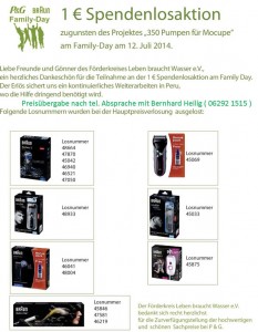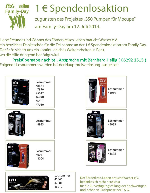 Walldürn. „Helfen und Gewinnen“ war das Motto der großen Tombola des Förderkreises „Leben braucht Wasser“. anlässlich des 60. Betriebsjubiläums der Firma P & G Werk Walldürn Im Rahmen des traditionellen „Family Day“ hatten sich viele Tausend Besucher auf dem Werksgelände eingefunden. Ein wahrer Run entwickelte sich auf den Tombolastand mit der 1 € – Spendenlosaktion zugunsten des Projektes „350 Pumpen für Mocupe / Peru“.