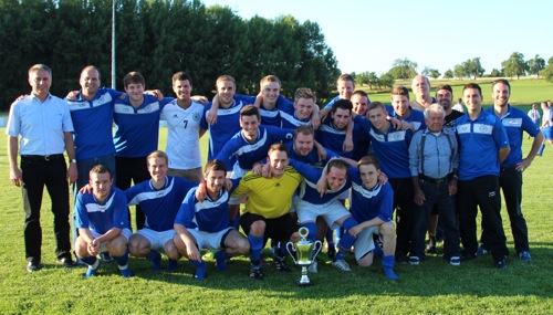 Donebach. (lm) Mit einem deutlichen 5:3-Sieg überzeugte der FC Schloßau gegen den FC Donebach im Elfmeterschießen und holte sich den begehrten Gemeindepokal, den Bürgermeister Dr. Norbert Rippberger an Christopher Götz als Spielführer der Siegermannschaft überreichte. Das Gemeindeoberhaupt beglückwünschte die Schloßauer, denen mit diesem glücklichen Ende nach einem absolut spannenden und ausgeglichenen Spiel die Titelverteidigung gelungen war, und dankte dem FCD mit Norbert Schnetz an der Spitze für die Austragung. Denn diese war aufgrund des schlechten Wetters gar nicht so selbstverständlich gewesen. Denn Gewitter und Dauerregen hatten die Halbfinalspiele ausfallen lassen, weshalb die Entspielpaarung ausgelost worden war.