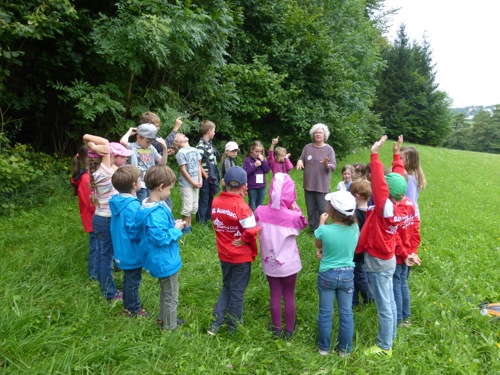 Maria Pektold-Heinrich, Naturpädagogin aus Obrigheim begeisterte die Kinder durch ihre spannende, spielerisch gestalte Führung durch Wald und Wiese. Vieles was sonst nicht beachtet wird gab es zu entdecken und erforschen. Eifrig und motiviert wurden gestellte Aufgaben gelöst und dabei ließ man sich auch nicht von einem Regenschauer ausbremsen.