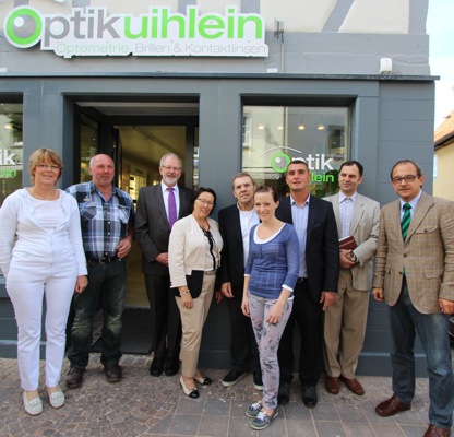 Auch Bauherr Konrad Grimm beglückwünschte Anne Uihlein zu ihrer Eröffnung. „Lange hat es gedauert, aber jetzt ist der ehemalige Krämerladen von Loni Herkert wieder in Schuss und mit Leben gefüllt. Oben die Werbeagentur SchreiberGrimm und unten Anne Uihlein mit ihrem Angebote an Brillen und Kontaklinsen.“