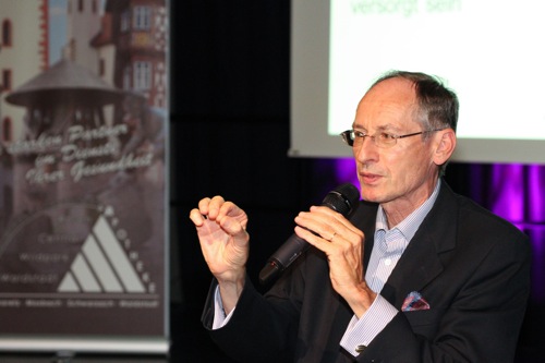 Für das Sandholzgewächs Okoubaka für den Verdauungsapparat gilt genauso wie für das Kürbisgewächs Zaunrübe (Bryonia) als schmerzlinderndes Mittel oder Silbernitrat (Argentum nitricum) welches bei Prüfungsangst und anderen Ängsten hilft: „alle homöopathischen Mittel sind im Regelfall frei von Neben- oder Wechselwirkungen, machen nicht abhängig und können parallel zu einer herkömmlichen Therapie angewandt werden“, so der Referent. Der Mediziner Dr. Wiesenauer wies mehrfach explizit darauf hin, dass je nach Krankheitsbildern auf jeden Fall ein Arzt zu konsultieren und eine begonnene medikamentöse Therapie auch fortzuführen sei. „Homöopathie stärkt die Selbstheilungskräfte des Menschen“, erklärte Dr. Wiesenauer die Wirkung dieser kleinen weißen Kügelchen. Er forderte das Auditorium zu Geduld auf, wenn ein Leiden schon Monate oder Jahre bestehe, können die homöopathischen Arzneimittel auch nicht innerhalb von Tagen wirken.