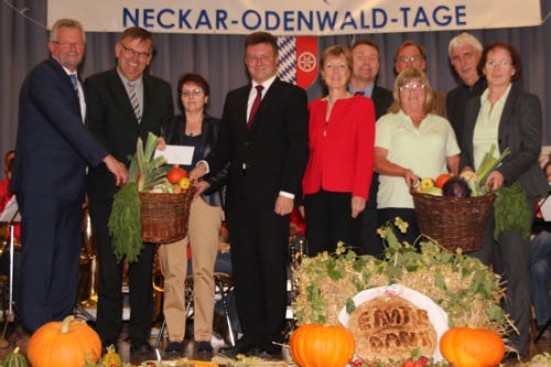 Bürgermeister Rainer Houck zeigte sich als Gastgeber der diesjährigen Neckar-Odenwald-Tage stolz und dankbar, dieses traditionell fröhliche Fest für alle Sinne mit unzähligen Helfern und dem Wissen ausrichten zu dürfen, dass die Odenwälder Bauern Teller wie Tank gleichermaßen gut bewältigen. Der Festredner des Tages – Dr. Clemens Dirscherl, Geschäftsführer des Evangelischen Bauernwerkes in Württemberg mit Sitz in Waldenburg-Hohebuch – ging in seinem Referat „Erntedank 2014 – zwischen Markt und Moral“ zunächst auf die grundsätzlichen Definitionen ein. Denn Spannungsfelder gäbe es überall im Leben und letztlich sei es wichtig, dass Geben und Nehmen sich die Waage halten, dass – wie in einer Ehe – die Balance gehalten werde. Es gebe weder Gut- noch Schlechtmenschen, nur einige neunmalkluge Moralisten mit einseitigen Sichtweisen. Da wir in Deutschland eben das Privileg hätten, dass der Bedarf an Nahrungsmittel schon überdeckt sei, berge das gleich mehrere „Gefahren“ in sich. Zum einen genüge es nicht mehr, satt zu sein. Man werde moralistisch, entweder bezüglich Tierschutz oder in Richtung ökologischer Nachhaltigkeit. Das würde wirklich armen Drittländern niemals einfallen, denn bekanntlich kommt immer zuerst der Hunger und dann die Moral.