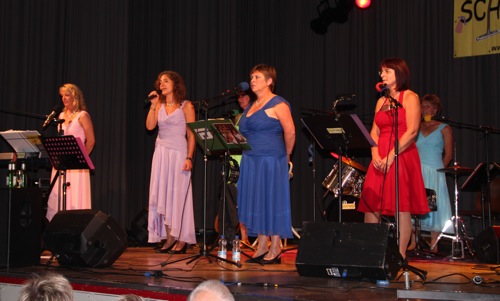 Nach der Pause hatte sich der Putztrupp dann verwandelt in eine Gruppe perfekt gekleideter Damen und bewies: „Wir können auch so“. Doch das schicke Outfit hatte keinerlei Bremswirkung auf die „Schlabbergoschn“, die sich über die vielen dominanten Männergene ausließen, die da z.B. wären: Fremd-Gen, Saufen-Gen, Nicht-nach-Hause-Gen. Wo doch Frauen nur auf ein einziges dominantes Gen, und zwar das Schuhe-kaufen-Gen zurückgreifen können. Undenkbar, dass auch nur ein einziges typisches Klischees – egal ob von Mann oder Frau – ausgelassen wurde. Tatsache war, dass die Halle bebte vor Lachsalven, Spontan-Applaus, Mitsingen und -klatschen und schließlich nach guten zwei Stunden bester Unterhaltung auch „Standing Ovations“ für die „Schrubbers“, deren starke Seite in frecher Comedy die musikalischen Schwachstellen mehr als ausglich.
