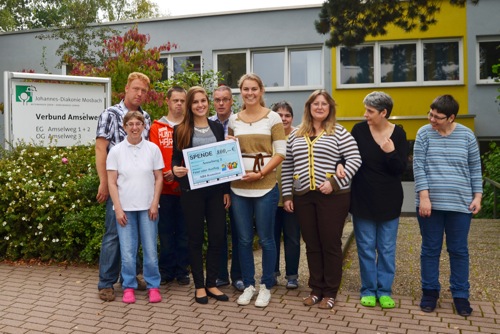 „Einen Ausflug mit dem Schiff, einen Besuch im Freizeitpark, ein gutes Essen, einfach Erlebnisse, die Freude machen, das möchten wir den Bewohnern schenken“, erklärt Katja Nagel bei der Spendenübergabe im Haus Amselweg am Schwarzacher Hof. Die Hemsbacher Abiturientin kennt die Johannes-Diakonie schon länger. Ihr Onkel lebt hier. So brachte die junge Frau als Mitglied des Abiball-Komitees den Vorschlag ein, hierher zu spenden. Zur Finanzierung des Festes hatte sie mit einigen Mitstreiterinnen bei der „Hemsbescher Kerwe“ einen Getränkestand betrieben – und dabei viel mehr als notwendig erwirtschaftet.