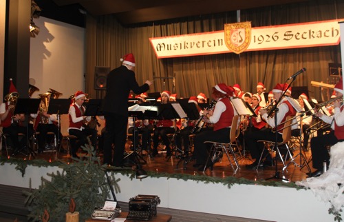 Und schließlich schloss das musikalische Programm der Seckacher Stammkapelle nach der rasanten Schlittenfahrt mit dem humorvollen „Typewriter“, bei dem Hermann Schmitt seine Fähigkeiten auf der Schreibmaschine unter Beweis stellte. Unterstützt von SOS-Jugendblasorchester verabschiedete sich der Musikverein Seckach mit dem traditionellen Schlussstück „Oh Du fröhliche“, indem das Publikum während seiner stehenden Ovationen zum Mitsingen eingeladen wurde.