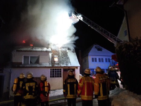 Höpfingen. (ots) Am frühen Dienstagmorgen, 30.12.2014, gegen 01.25 Uhr, brach in einem Einfamilienhaus in Höpfingen aus bisher ungeklärter Ursache im Erdgeschoß ein Brand aus. Der Brand war durch einen Nachbarn entdeckt und bei der Rettungsleitstelle gemeldet worden. Die Feuerwehren Walldürn, Höpfingen und Waldstetten wurden alarmiert. Die Löscharbeiten bei denen gut 50 Feuerwehrleute, unter anderem auch die Drehleiter eingesetzt waren, dauerten bis etwa 03.30 Uhr an. Die 7köpfige Familie war zum Zeitpunkt des Brandausbruchs glücklicherweise nicht in ihrem Wohnhaus. Ersten Schätzungen zufolge beträgt der Sachschaden voraussichtlich mindestens 70.000 Euro.