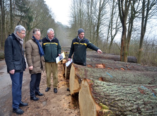 Im Main-Tauber-Kreis stehen in Kürze wieder rund 2000 Kubikmeter Wertholz zur Auktion. Die Gebotseröffnung findet am Montag, 23. Februar, im Forstamt des Landratsamtes Main-Tauber-Kreis in Tauberbischofsheim statt. Landrat Reinhard Frank und Erster Landesbeamter Dr. Ulrich Derpa haben sich jetzt auf dem Lagerplatz in Wertheim-Nassig über den bevorstehenden Holzverkauf informiert. Forstamtsleiter Jürgen Weihmann und Revierleiter Frank Teicke stellte ihnen das aktuelle Angebot vor.