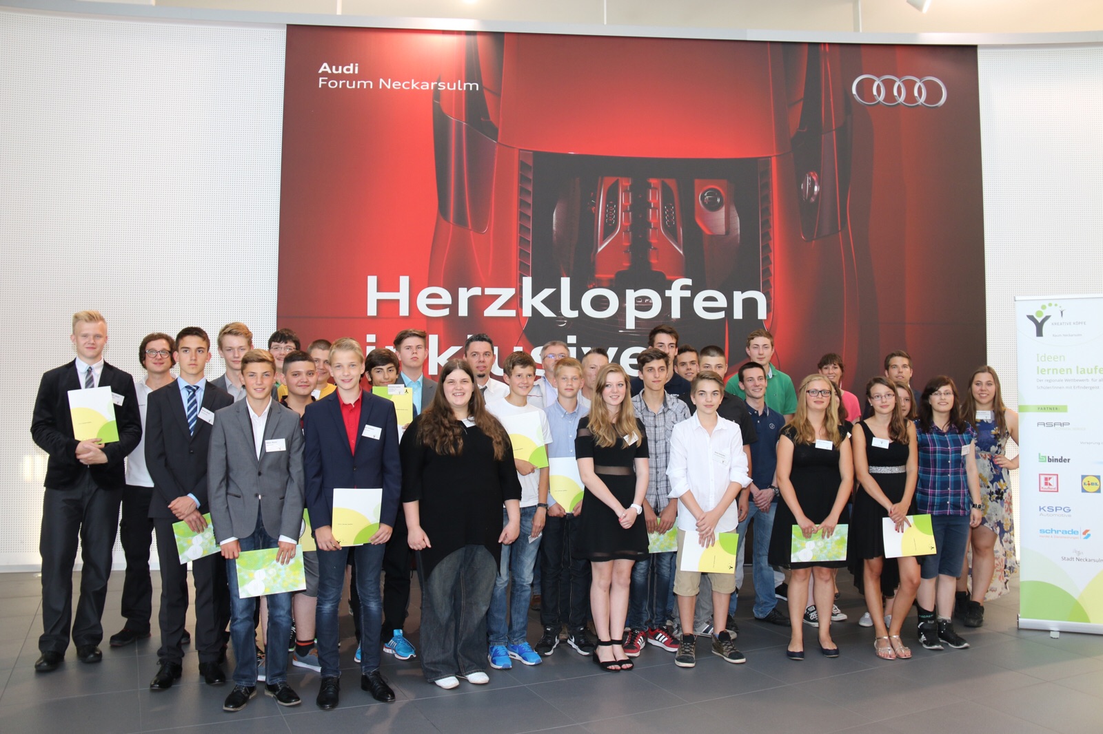 Zum Abschluss des Schülerwettbewerbs „Kreeative Köpfe“, der erstmals im Raum Neckarsulm stattfand, wurden die Preisträger im Audi Forum Neckarsulm ausgezeichnet. (Foto: pm)
