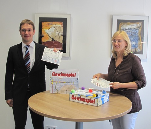 Dr. Björn-Christian Kleih mit Isabella Walter, Nahverkehrsexpertin beim Landratsamt, bei der Auslosung der Gewinner nach dem Aktionstag „Natürlich mobil“. (Foto: LRA)